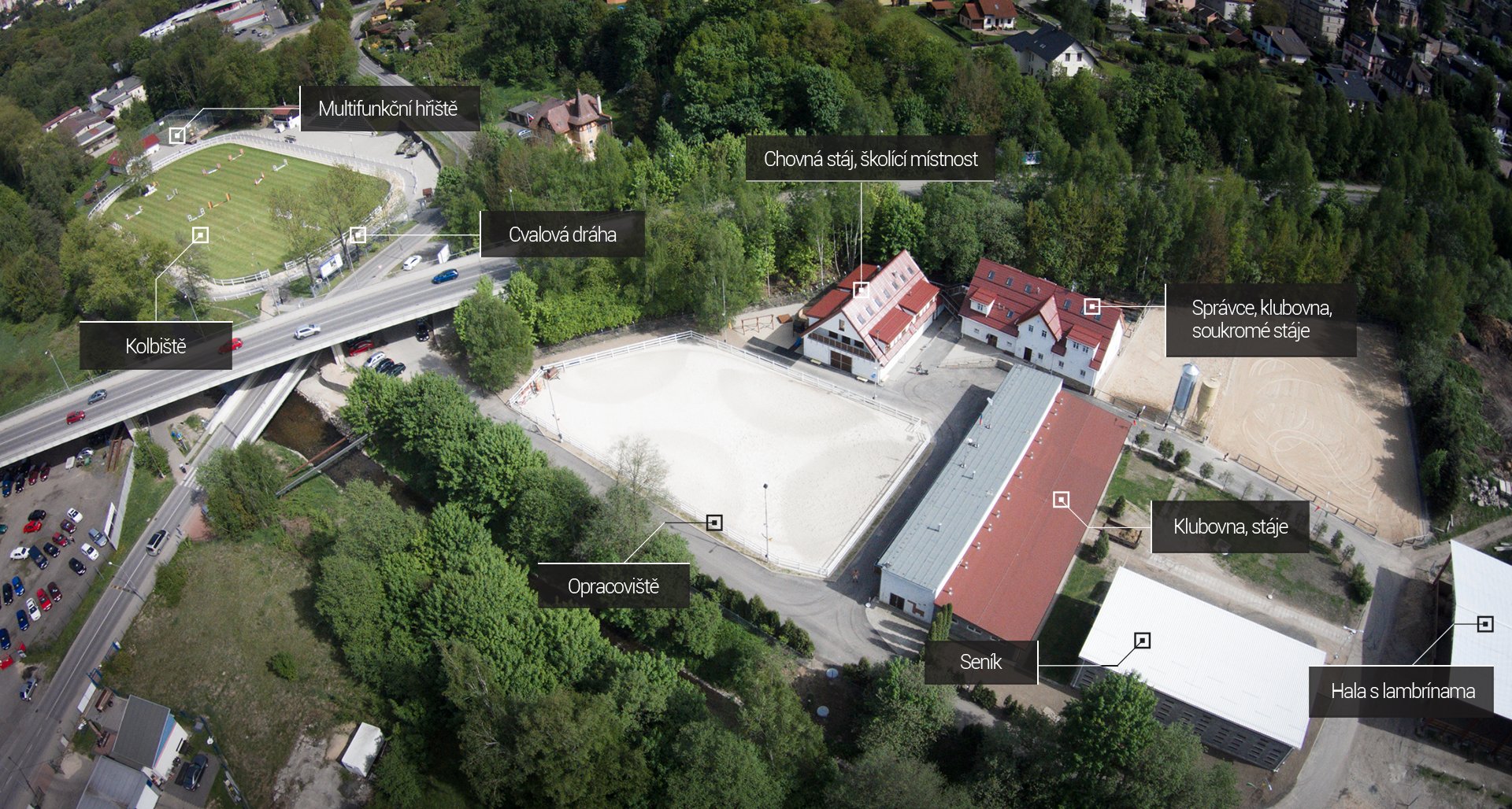 Prostorná krytá hala s lambrinami, pro možnost tréninku ve špatném počasí.